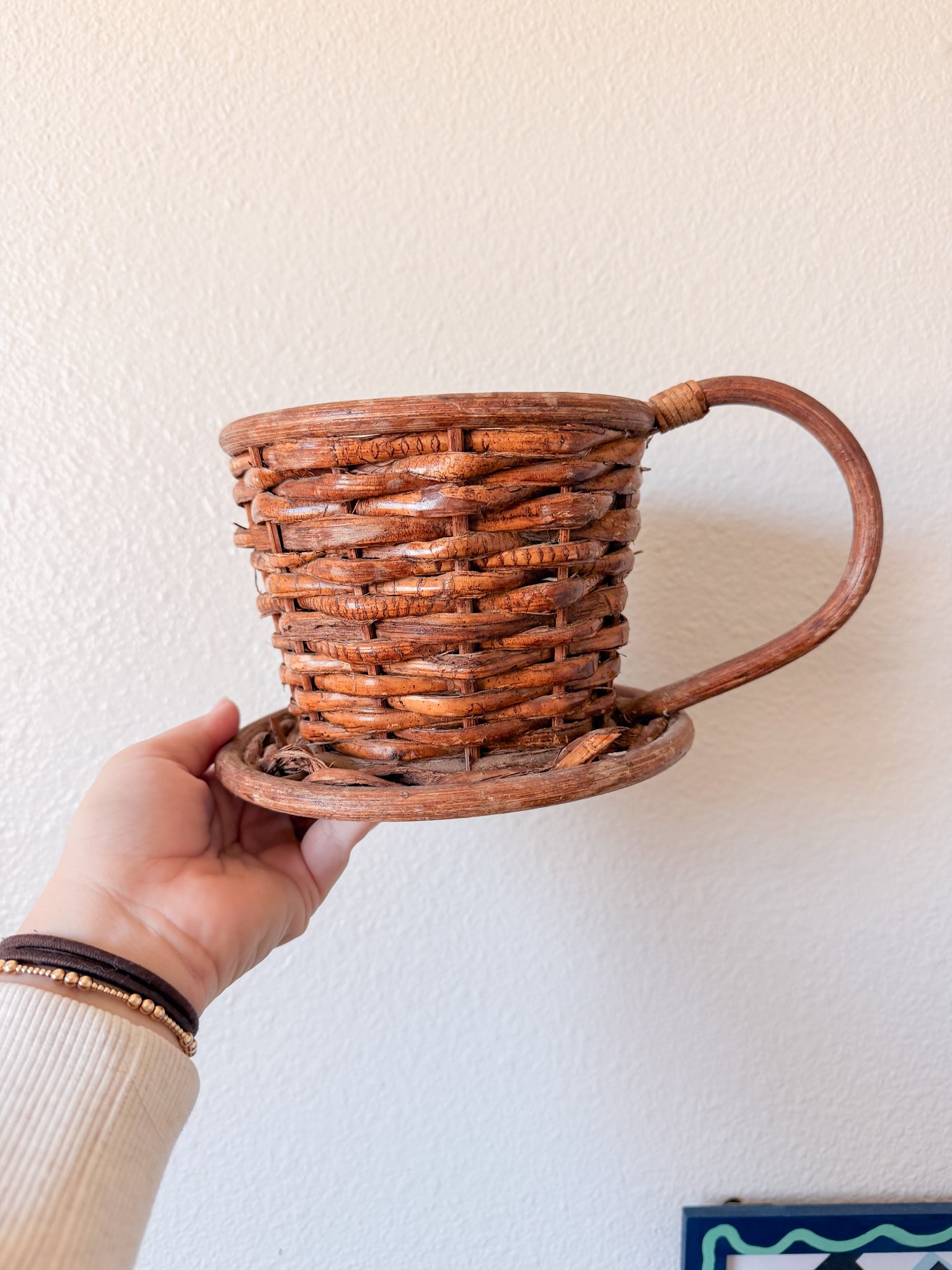 -This wicker basket has a handle and base that makes it look like a teacup.
