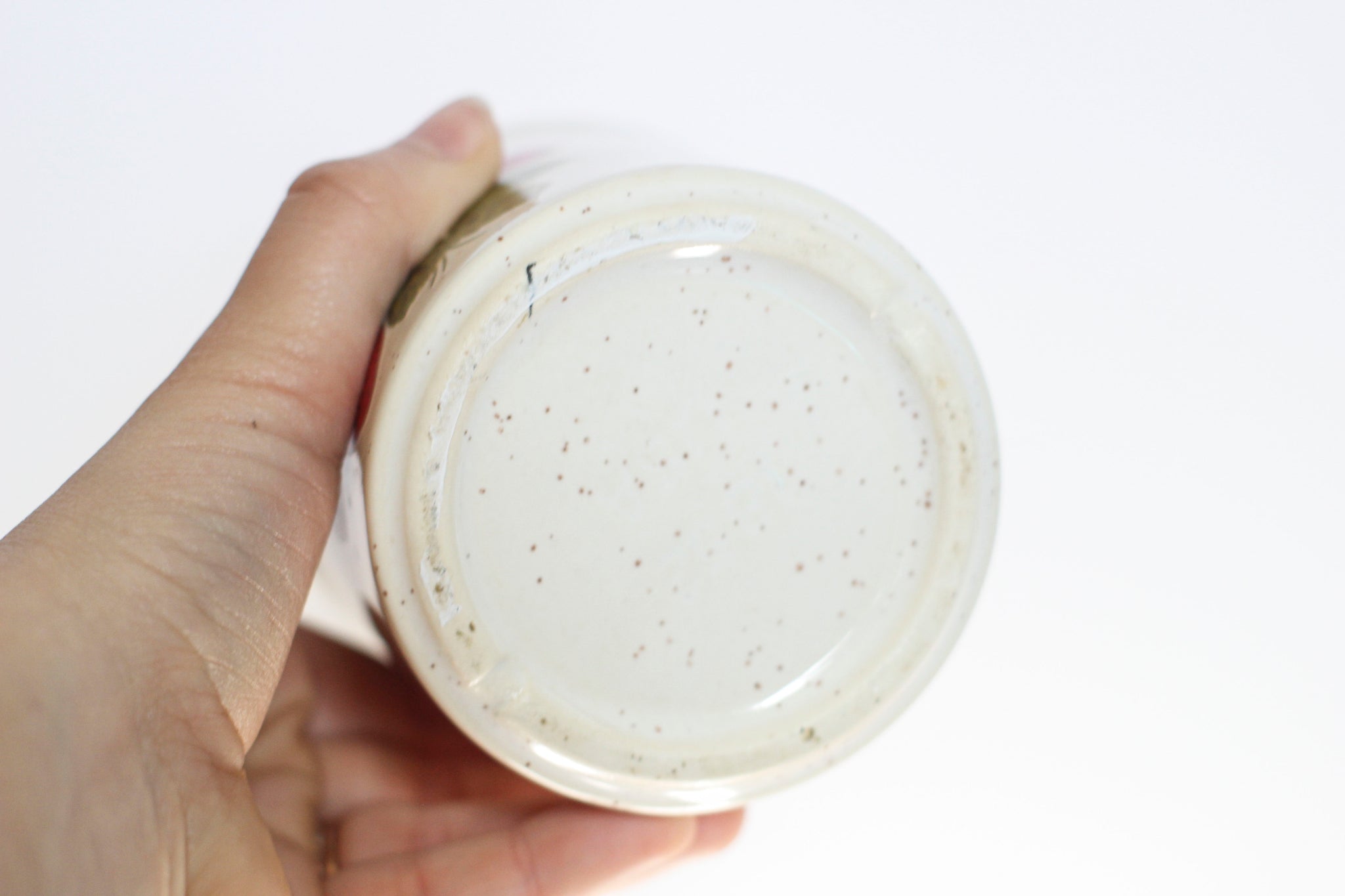 -The cup is ivory with brown speckling. There are four red strawberries with leaves and flowers painted on the front.