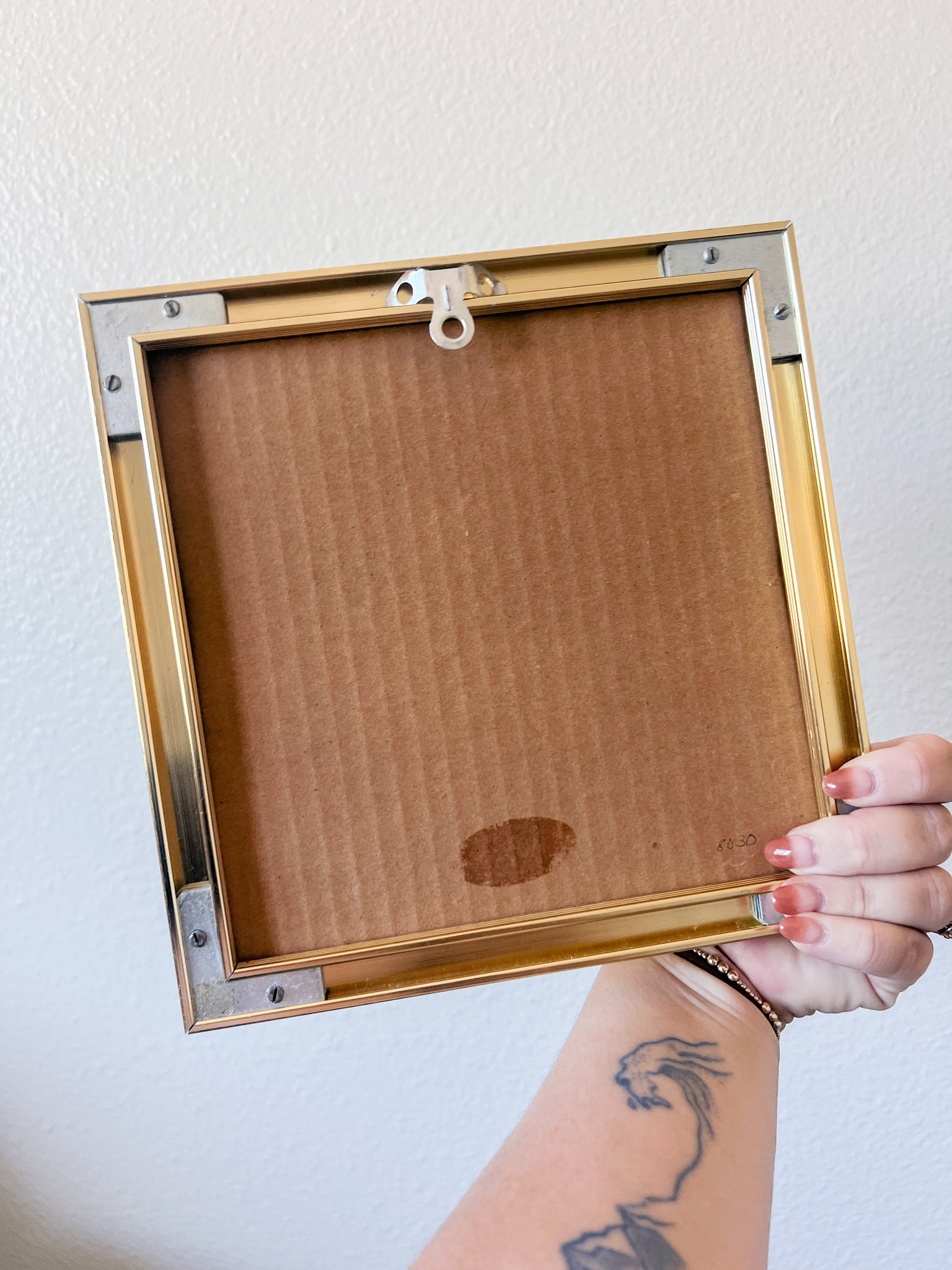 -It's framed in a square gold frame. There is hanging hardware on the back