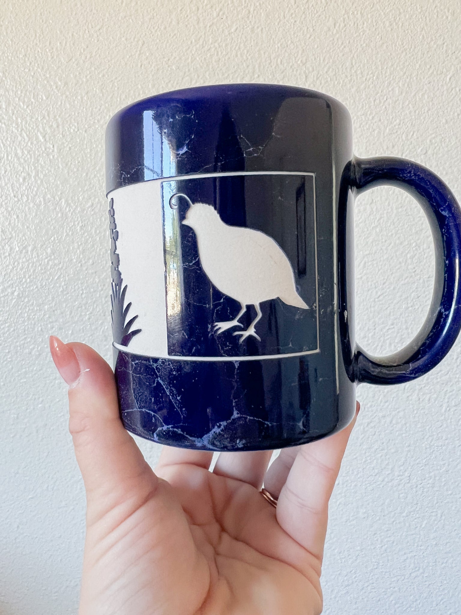 -This navy blue coffee mug has southwestern imagery etched in in a textured material.