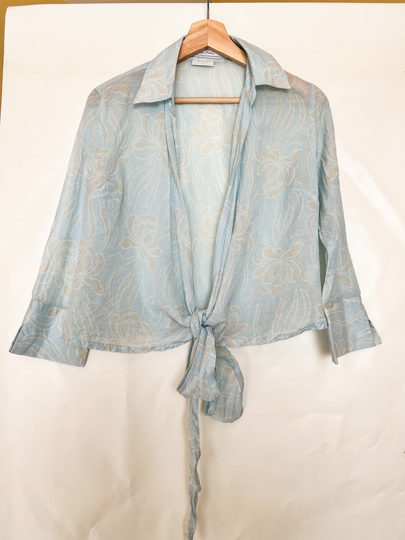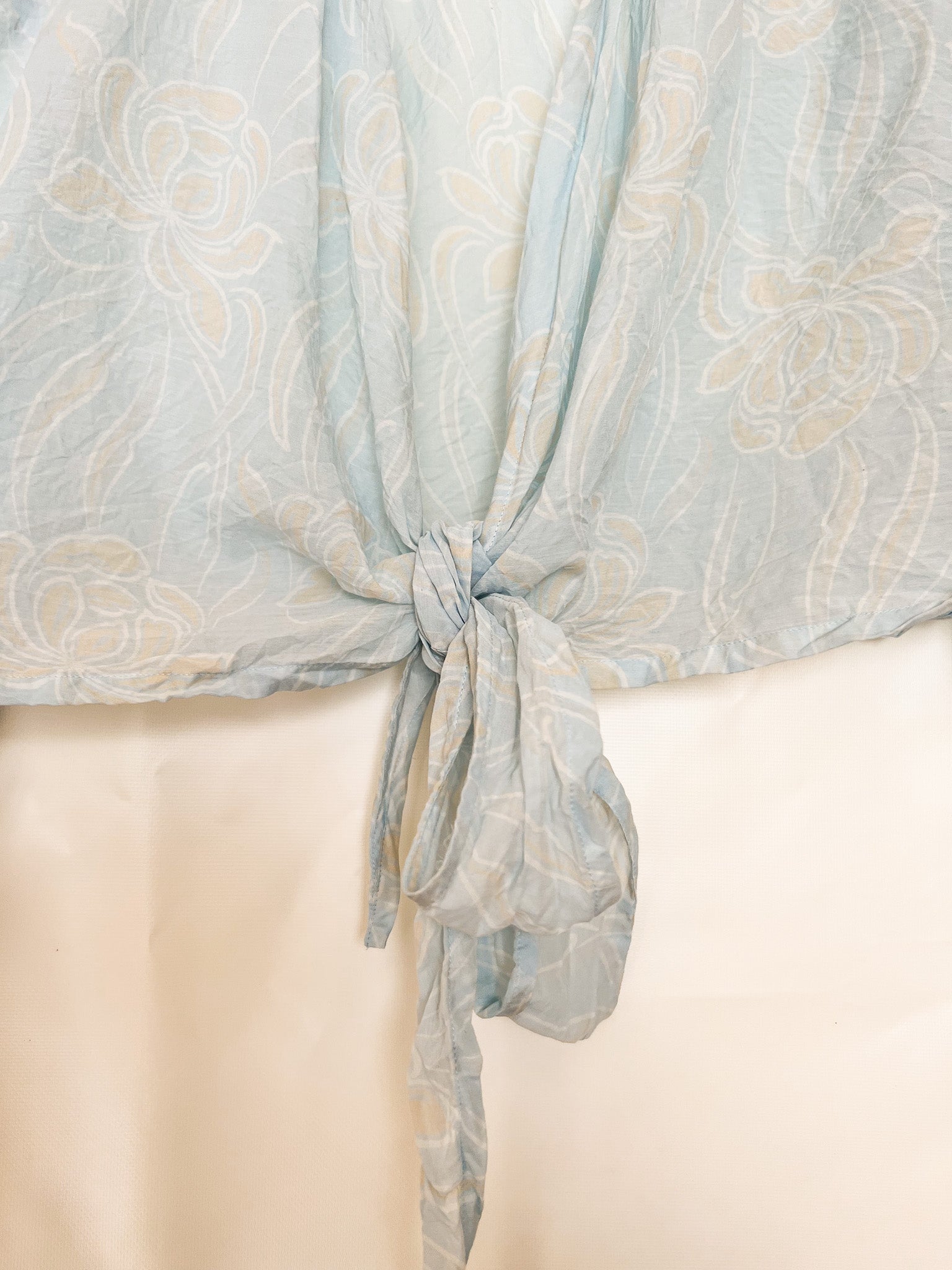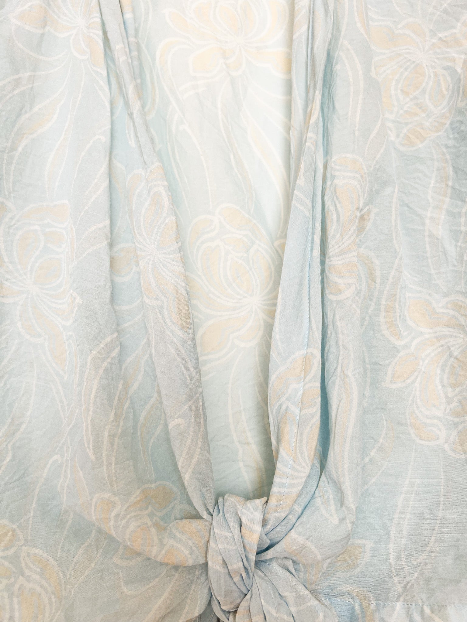 -The top is sheer and light blue with white and gray patterning. There are no buttons and it simply ties at the bottom. It is made of a silk/cotton blend.
