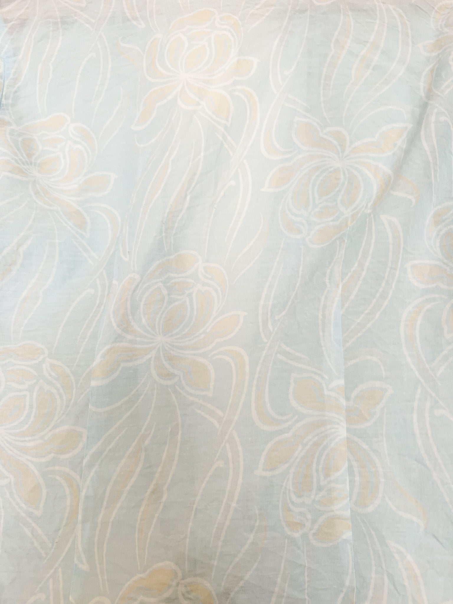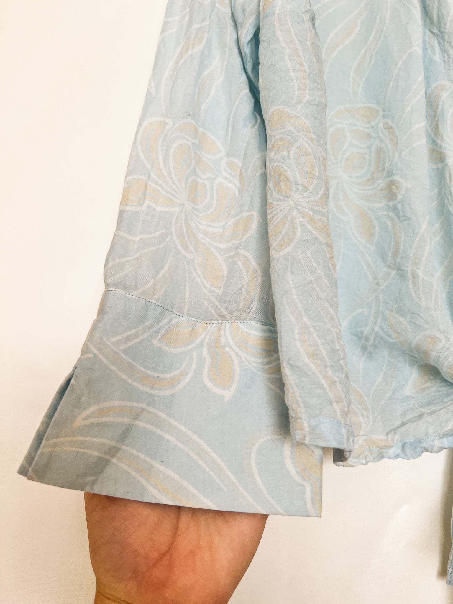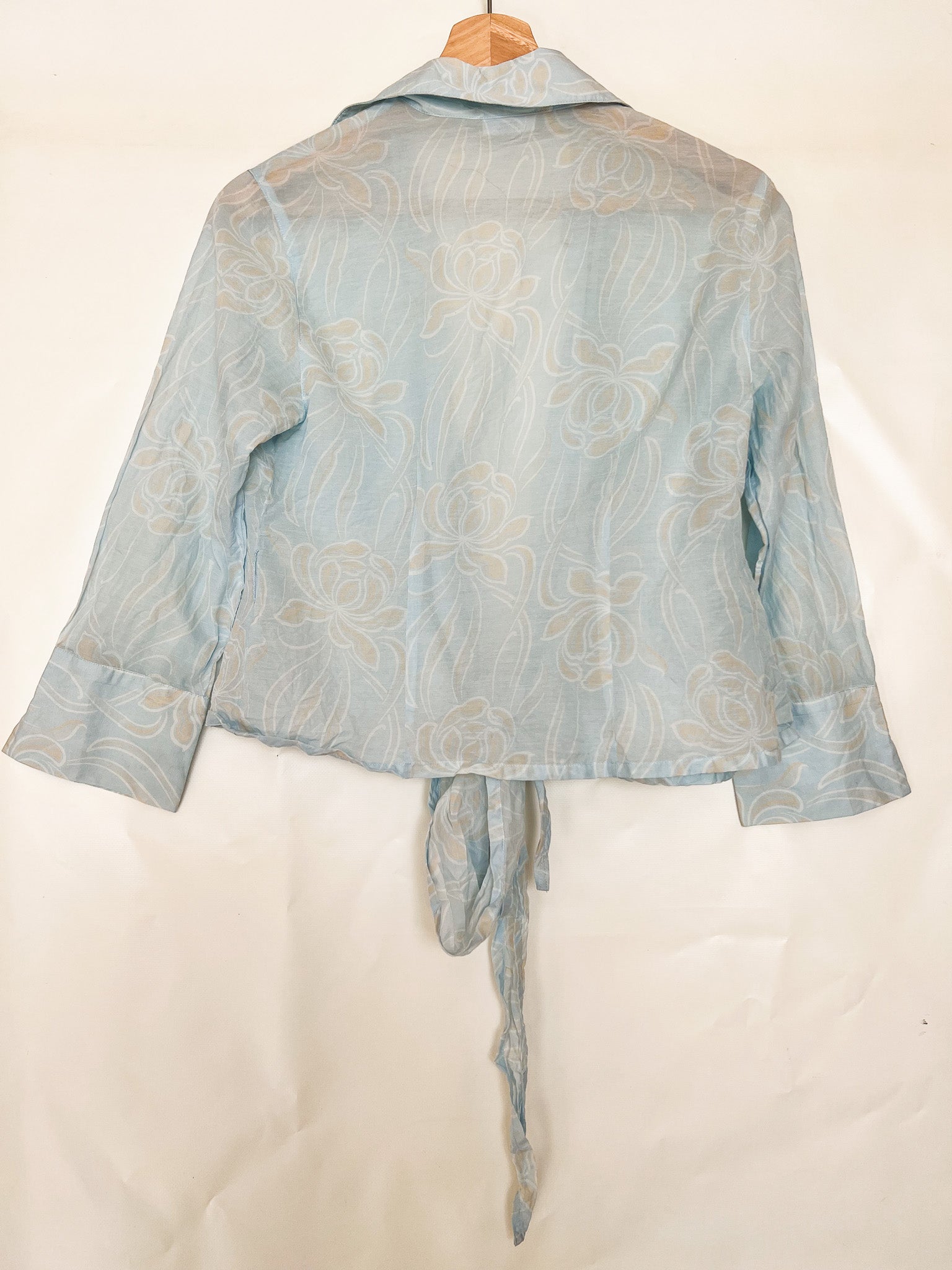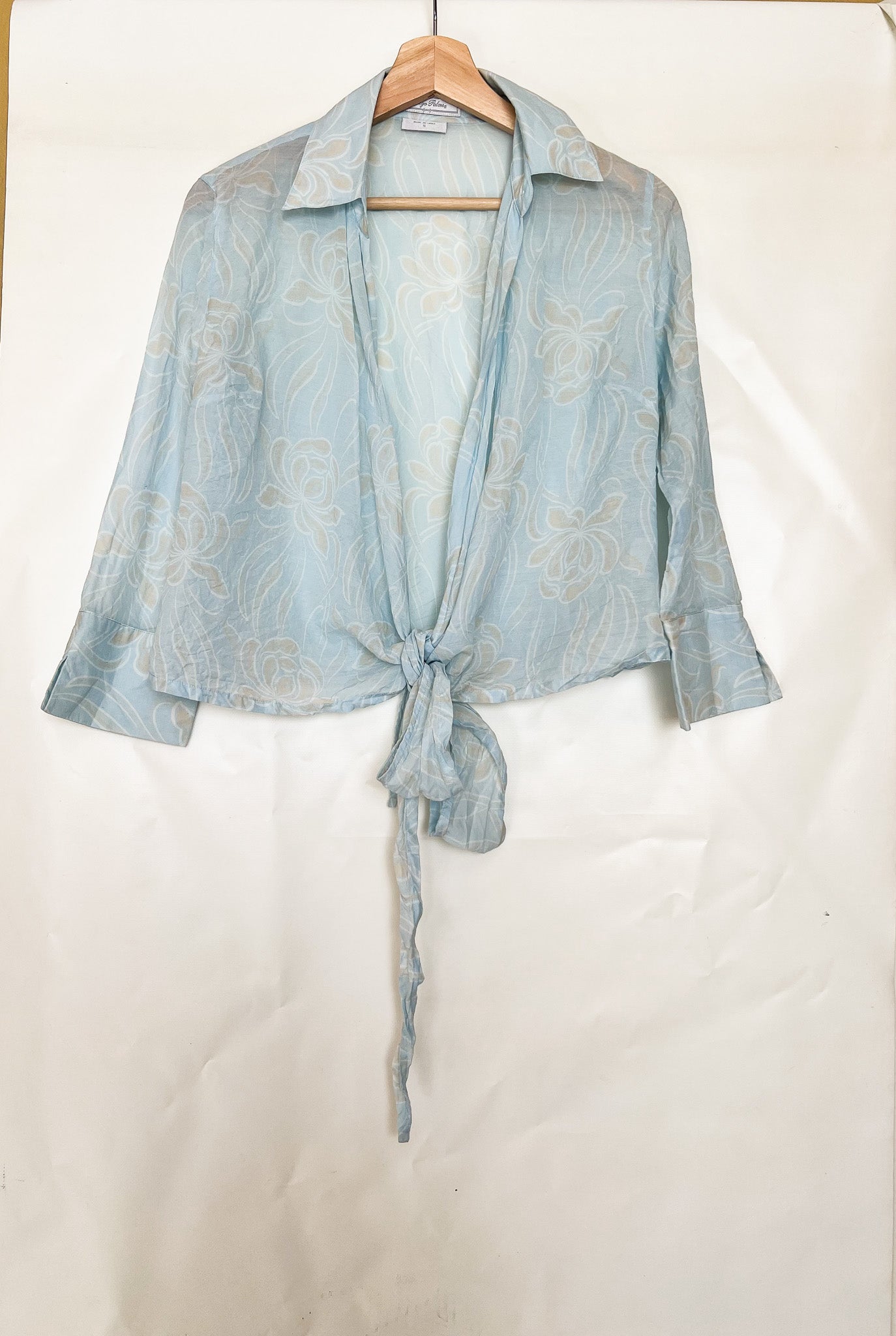 -The top is sheer and light blue with white and gray patterning. There are no buttons and it simply ties at the bottom. It is made of a silk/cotton blend.